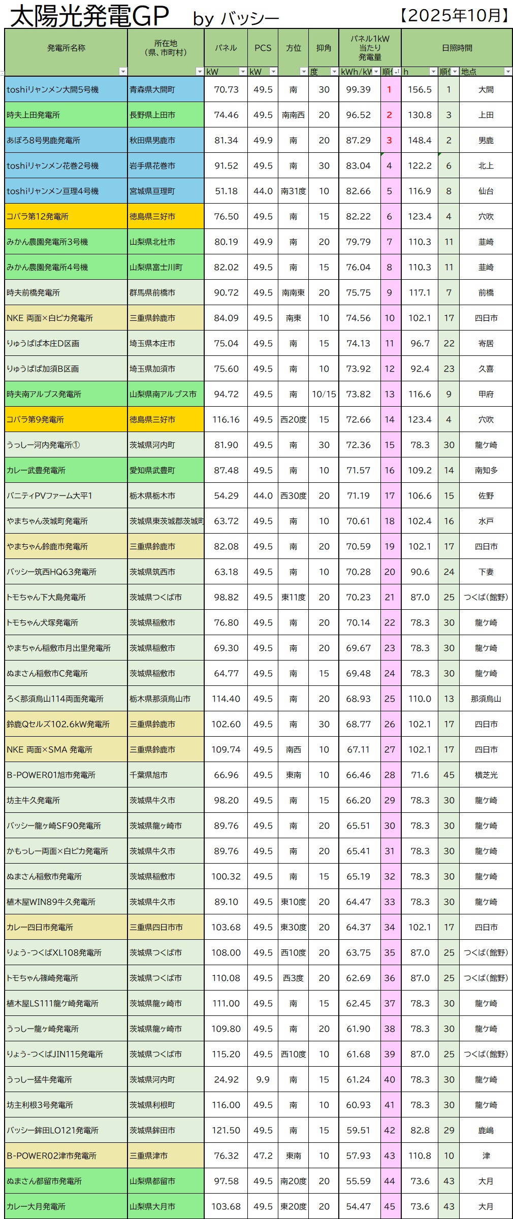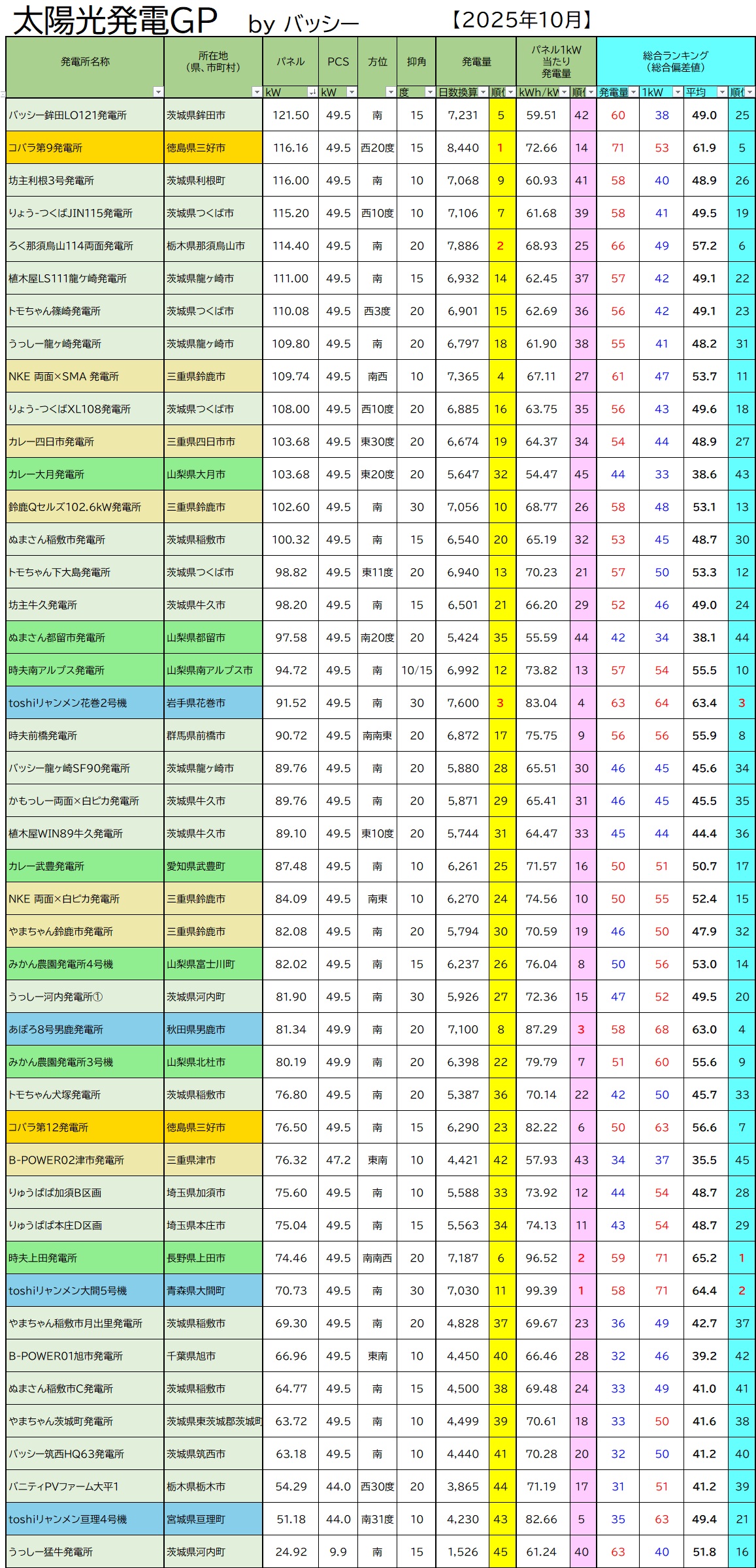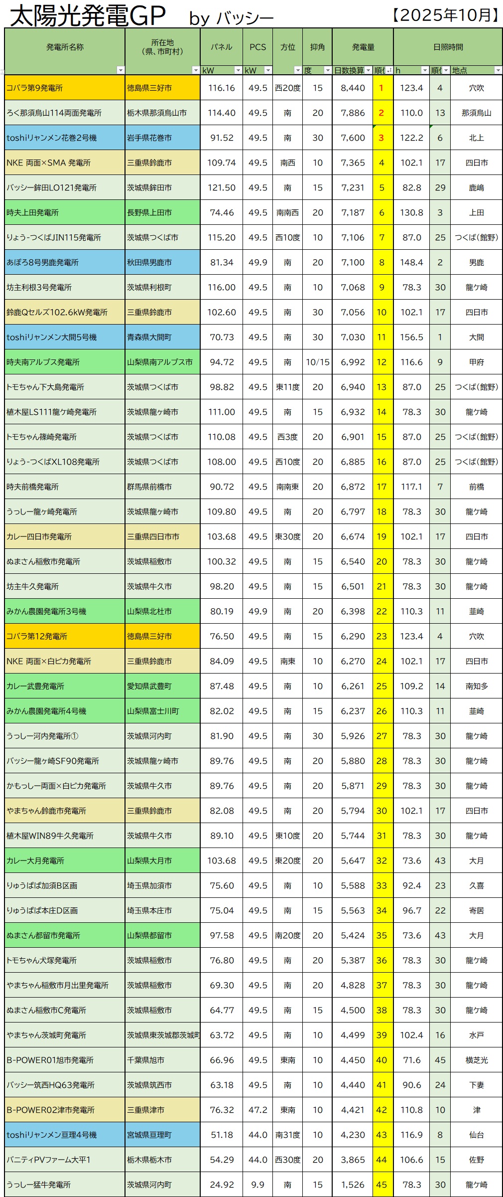 このランキングは、単純に1ヶ月の総発電量のランキングになります!