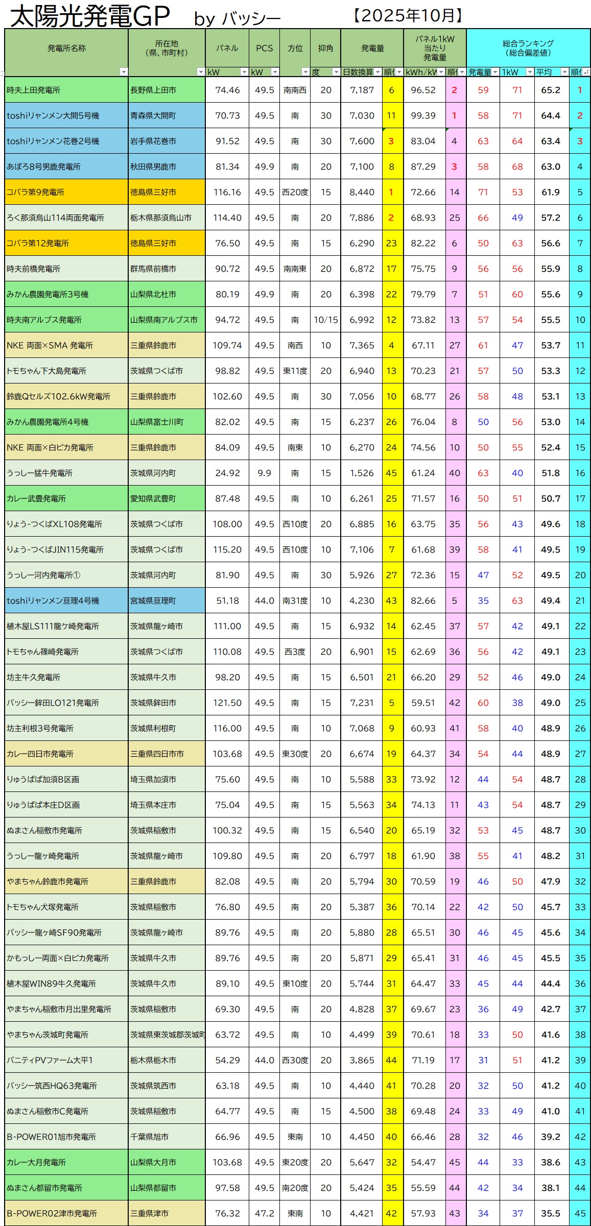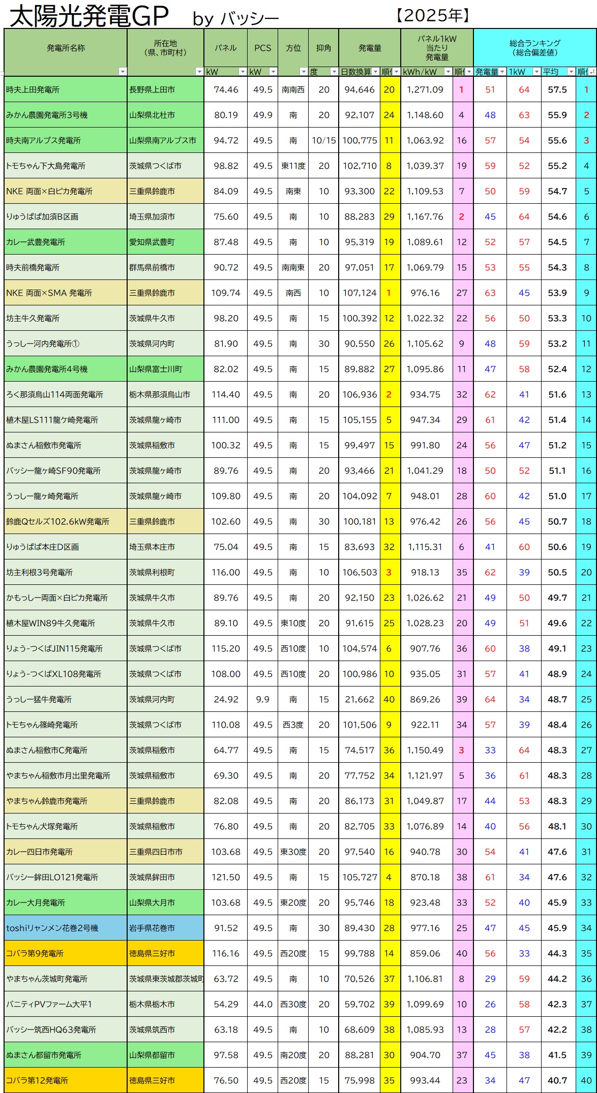 このランキングは、”総発電量”および”パネル1kW当たり発電量”のランキングを統合した“偏差値方式”のランキングになります!
