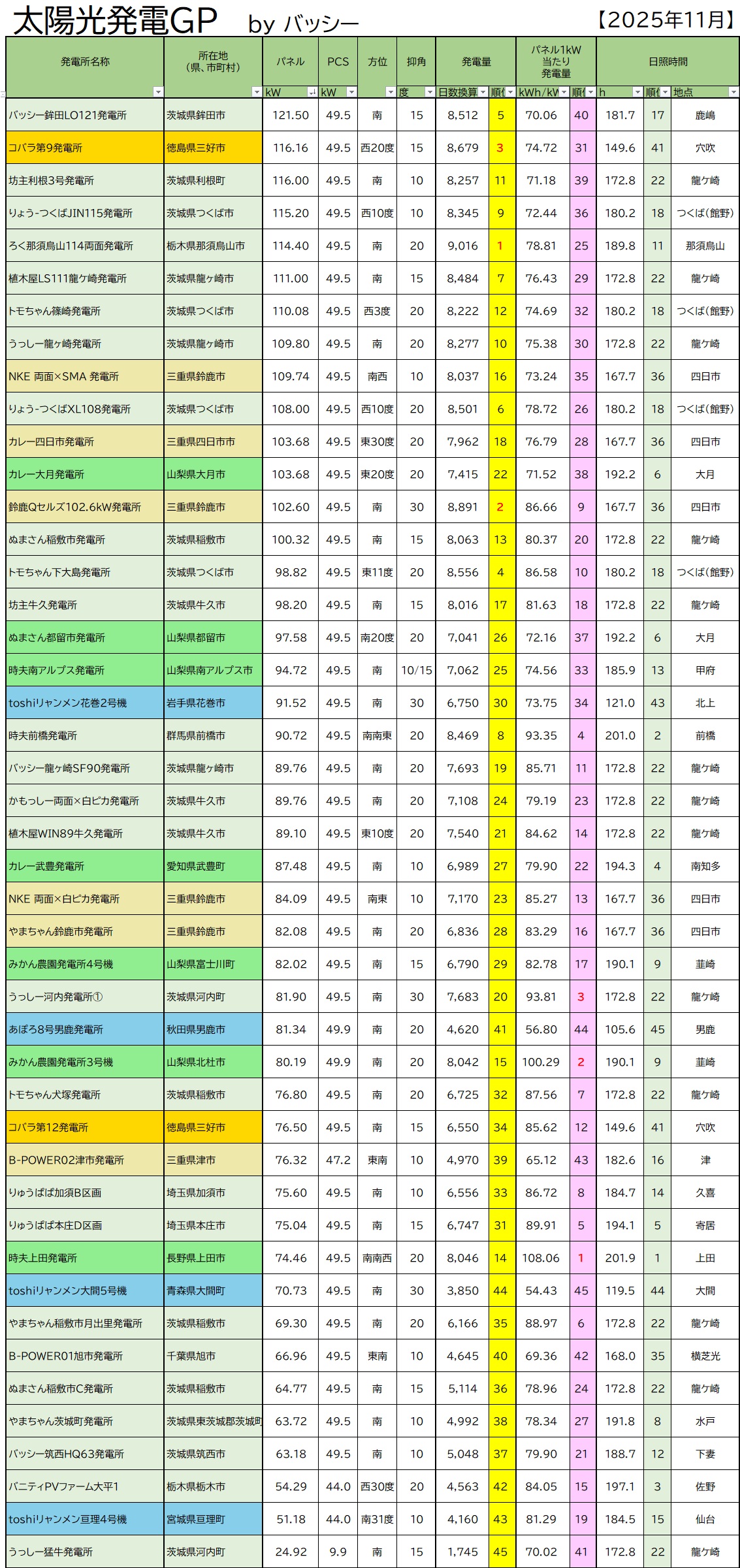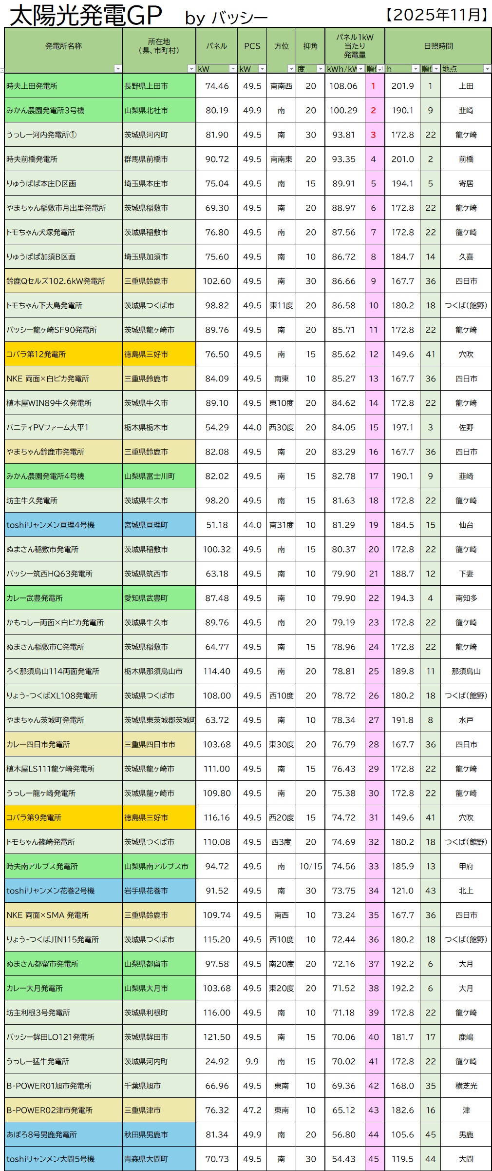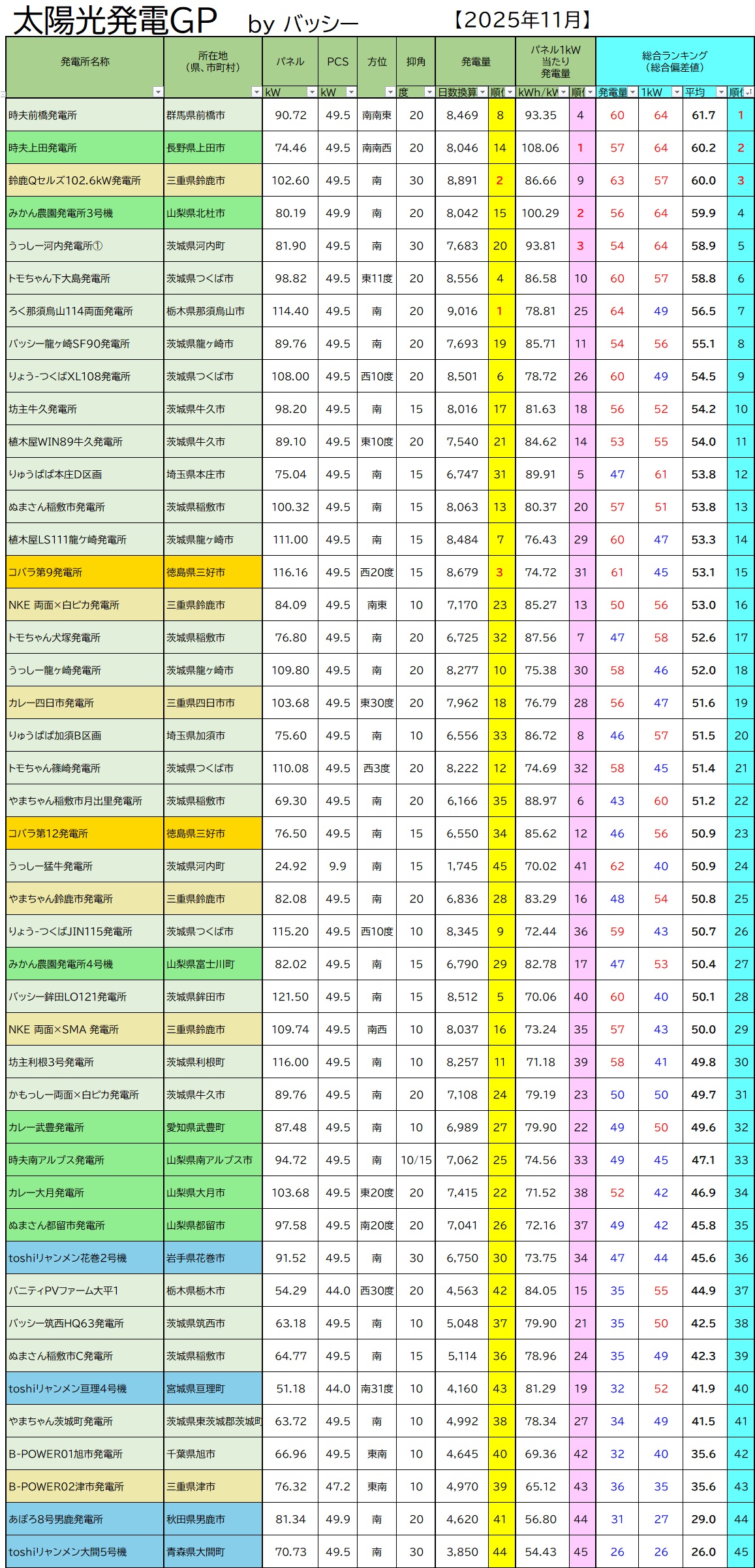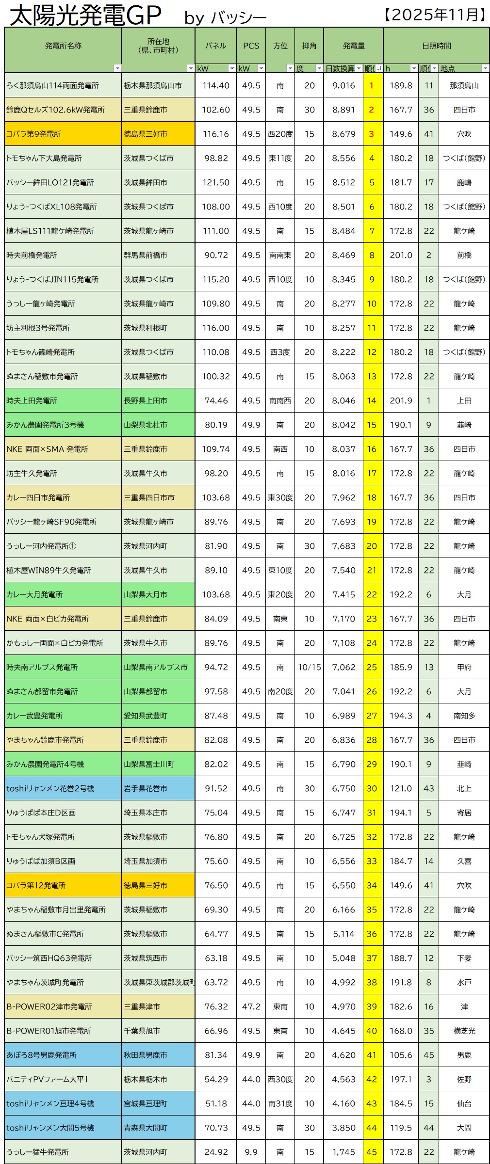 このランキングは、単純に1ヶ月の総発電量のランキングになります!