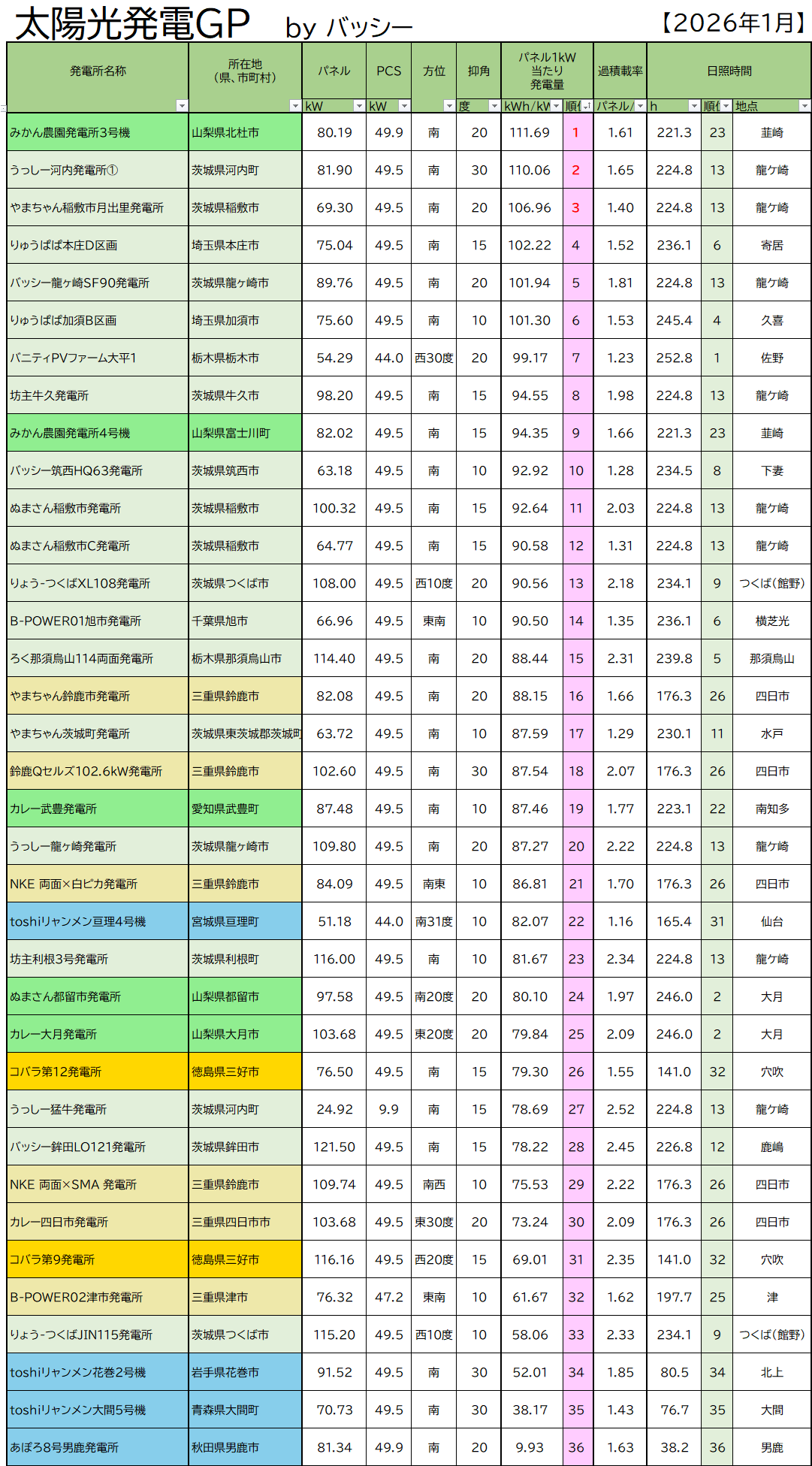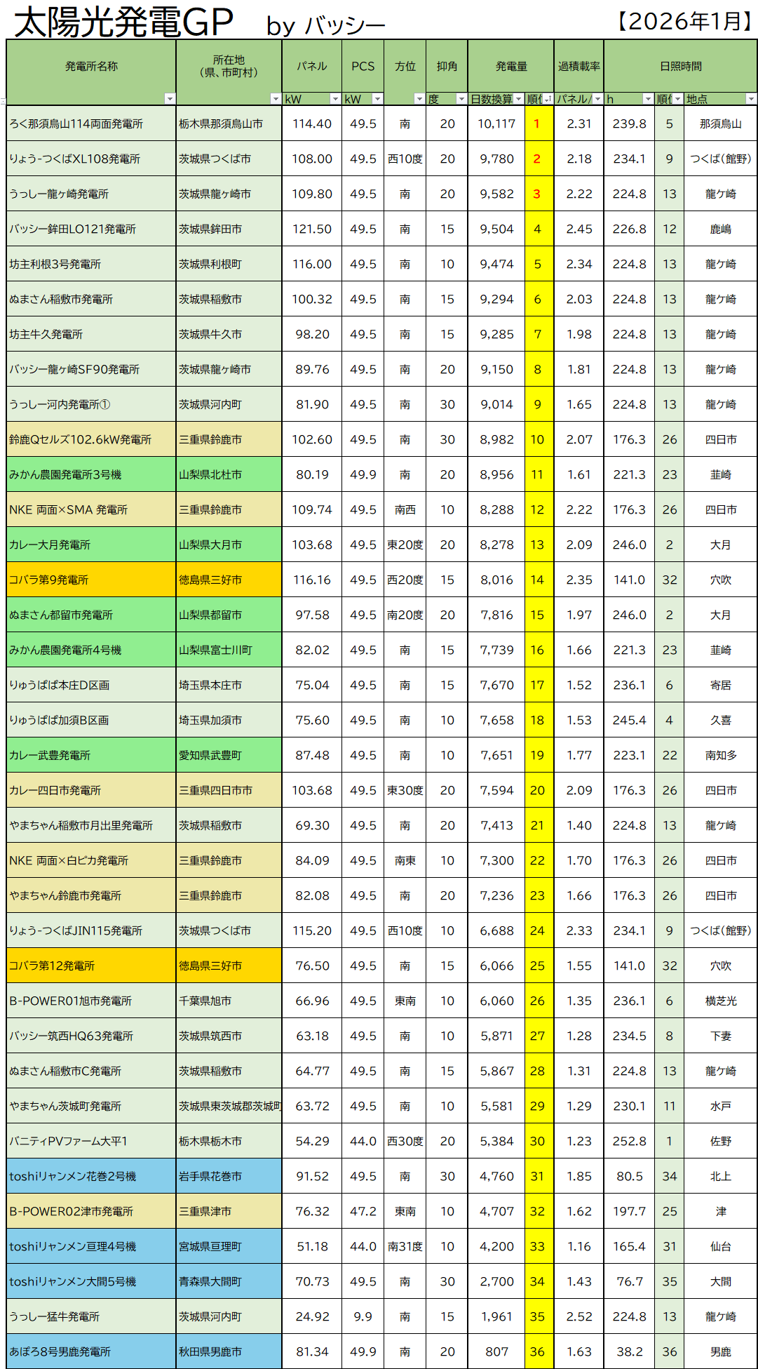このランキングは、単純に1ヶ月の総発電量のランキングになります!