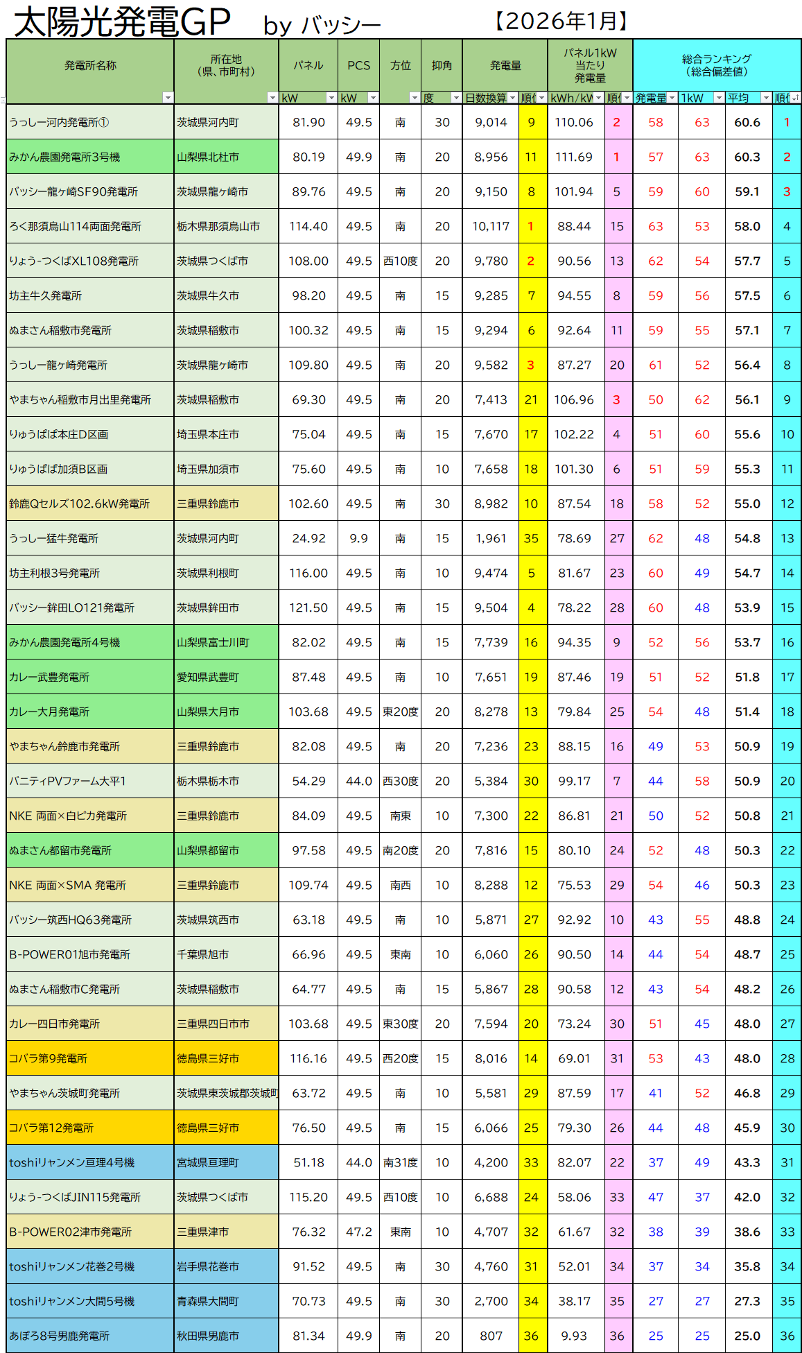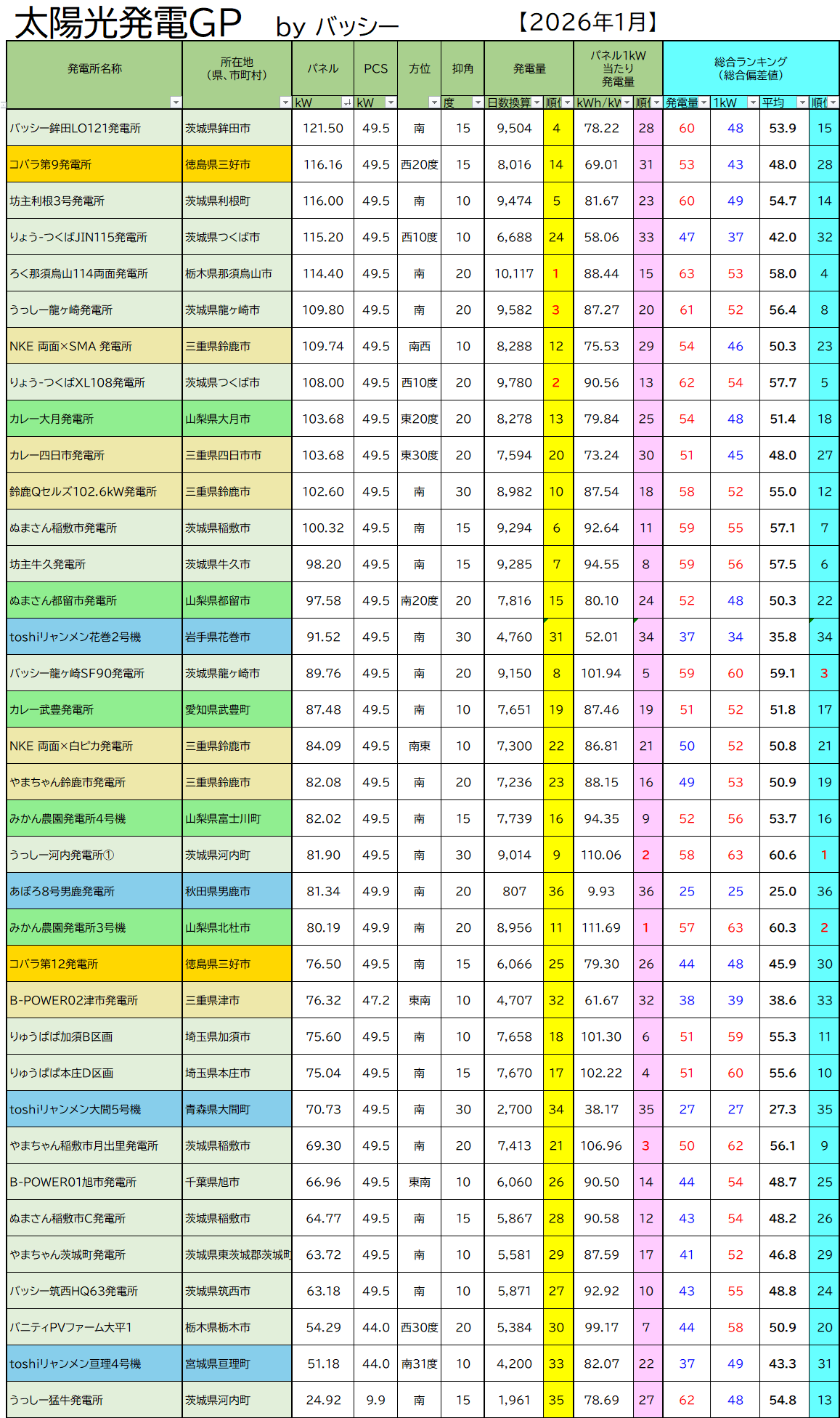 このランキングは、”総発電量”および”パネル1kW当たり発電量”のランキングを統合した“偏差値方式”のランキングになります!