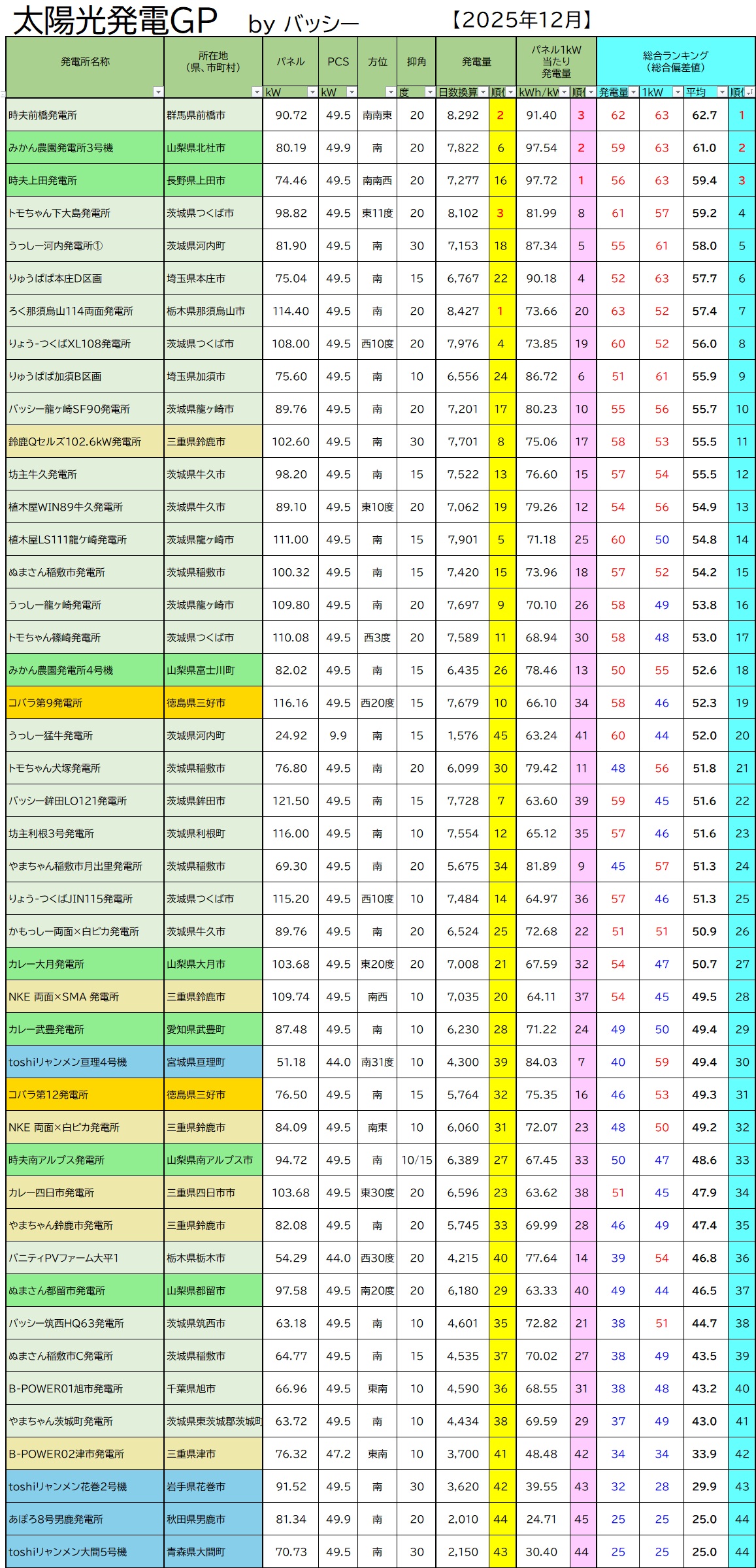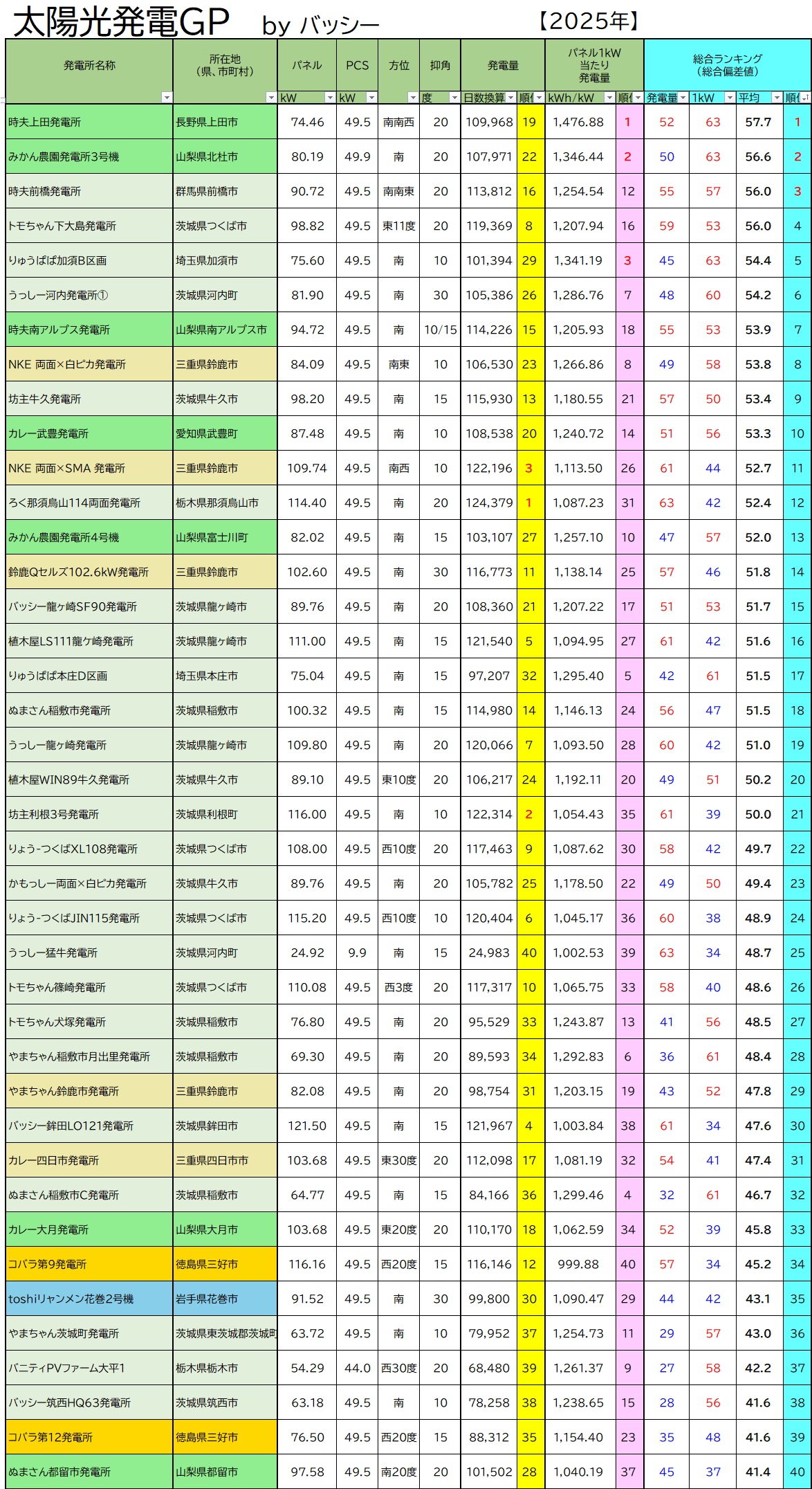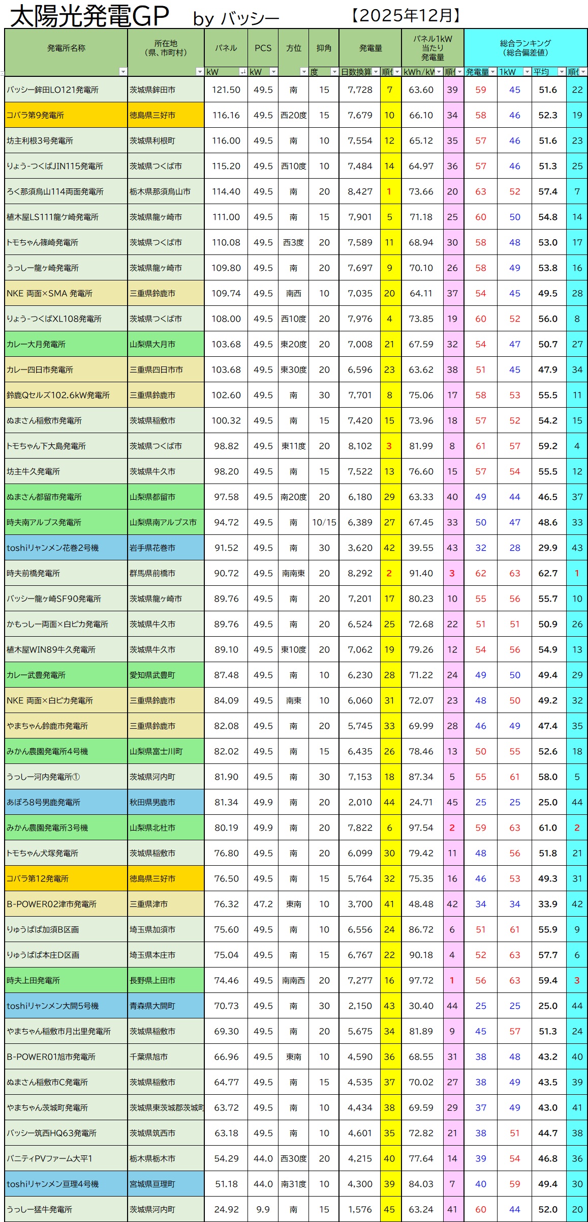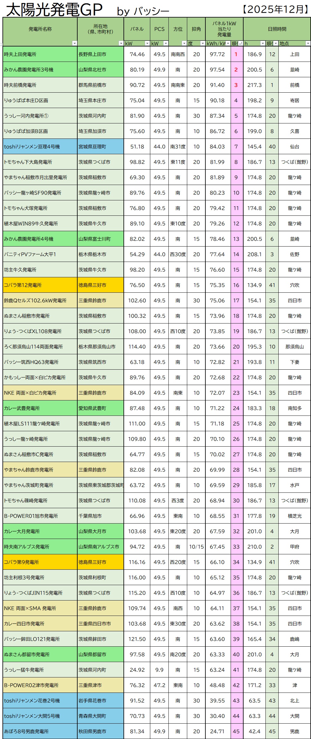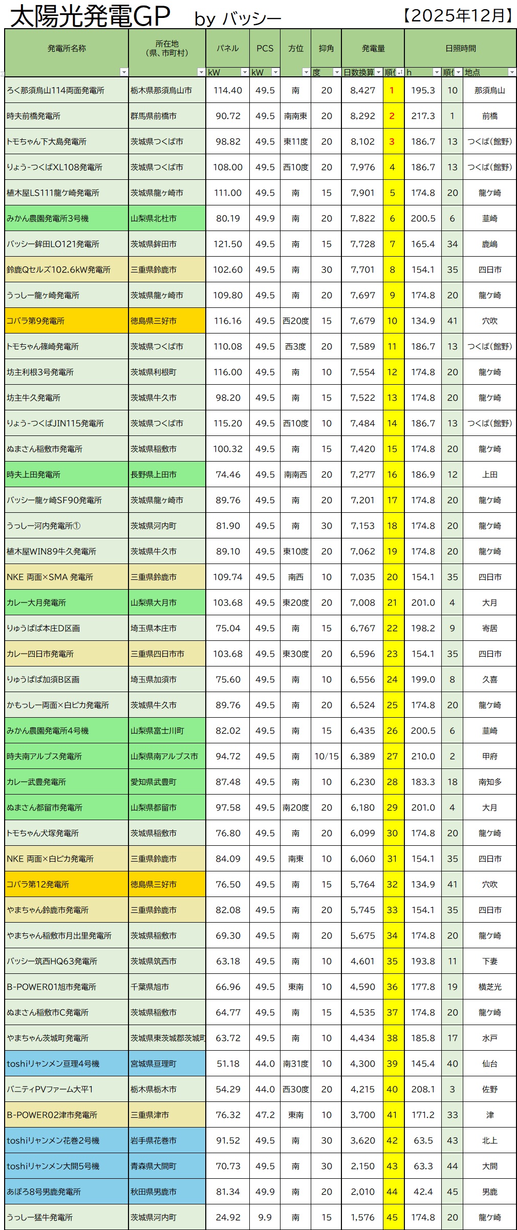 全国の太陽光発電家の皆さん、太陽光発電所の発電ランキング、